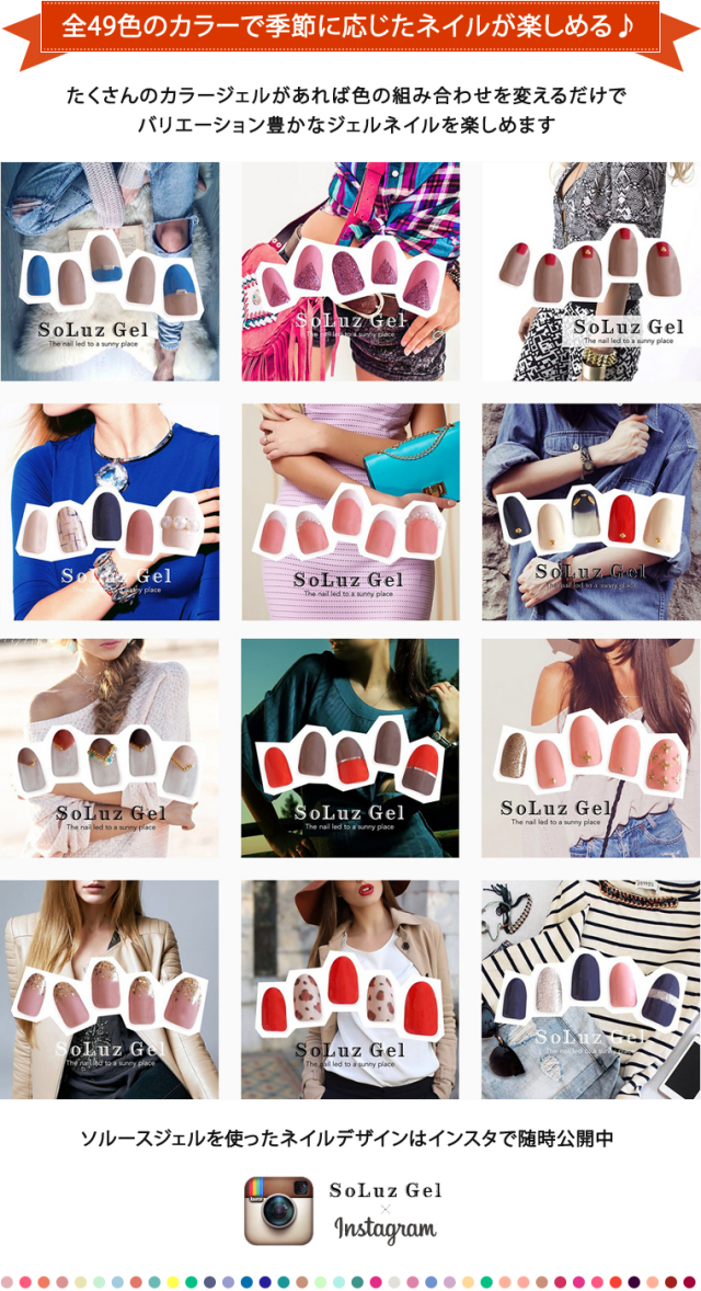 SoLuzGel厳選49色カラージェルをすべて揃えると、お友達とネイルアートを思う存分楽しめます。