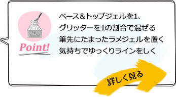 ベース&トップジェルを1、グリッターを1の割合で混ぜる筆先にたまったラメジェルを置く気持ちでゆっくりラインをしく